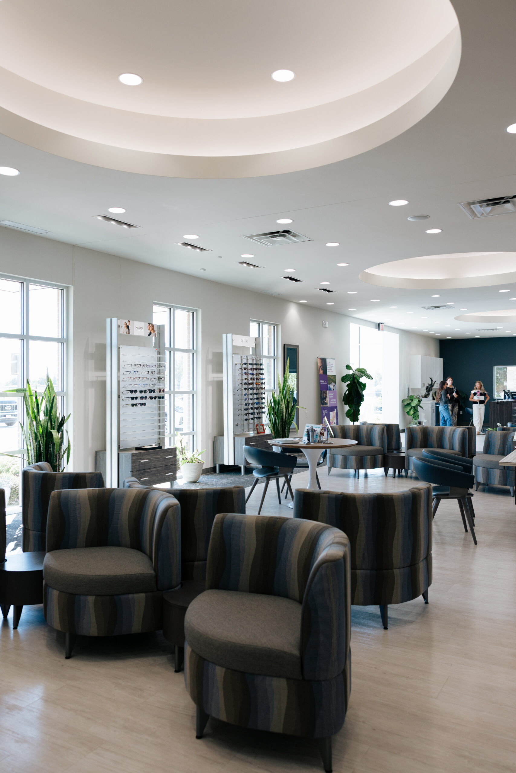 Once you arrive, walk in either side of our front doors. Directly in front of you you’ll see a check-in desk. Let the optician know you’re here, grab a free drink, and we’ll help you with every step of your appointment: